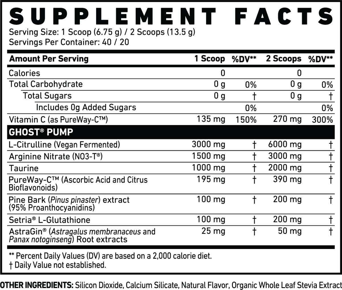 GHOST® PUMP raises the bar with even more of the pump ingredients we all love...L-Citrulline (Vegan Fermented), NO3-T® Arginine Nitrate (a patented pump ingredient that we really think is the best EVER) and some awesome inclusions (Setria® and PureWay-C™), plus it's in some of our favorite GHOST® flavors.