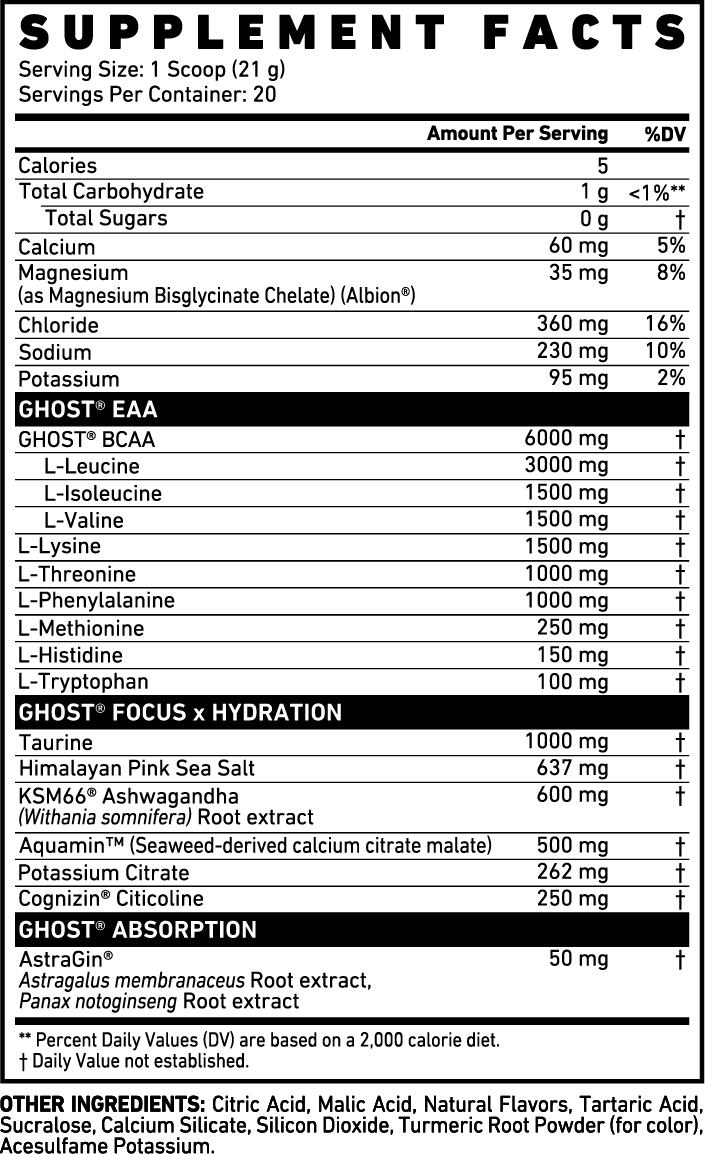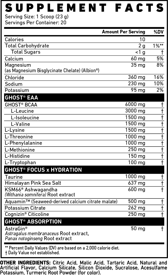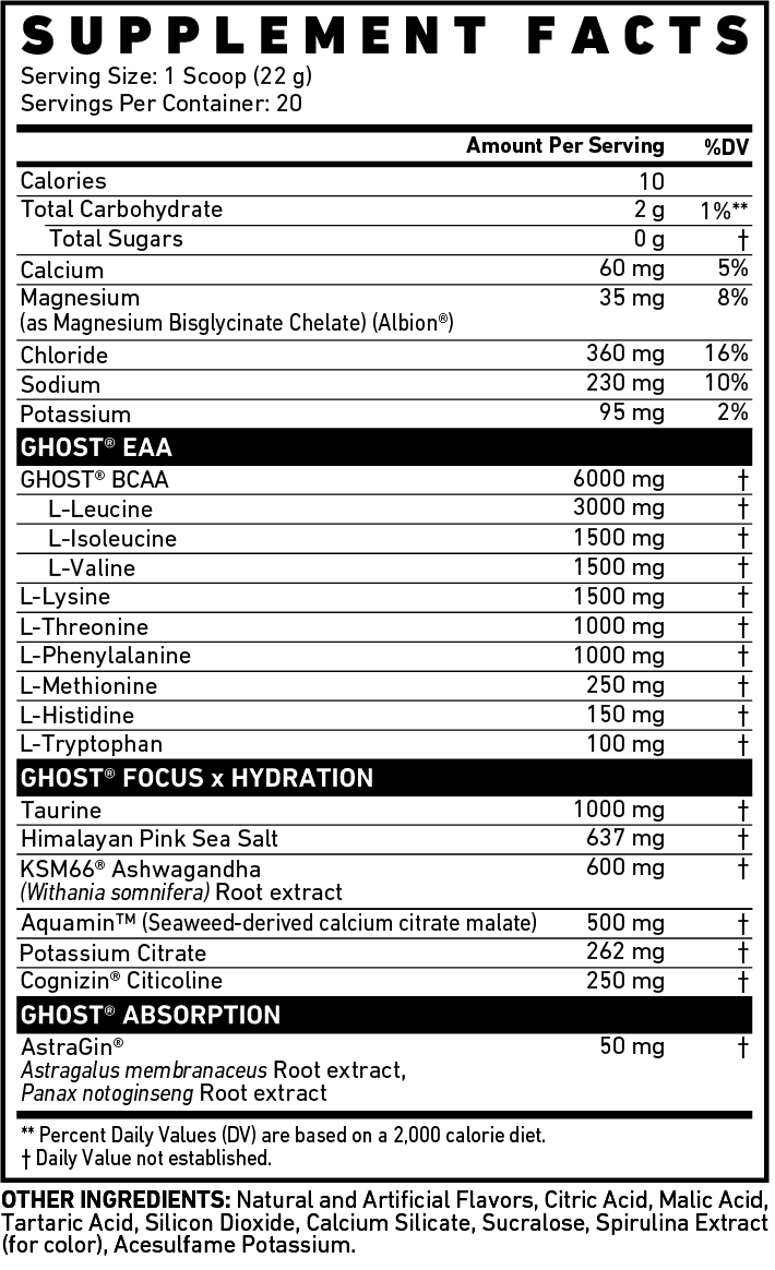 Mix each scoop (serving) of GHOST® INTRA with 14-16 oz of water or beverage of choice. Vary amount of liquid to taste. Consume during or after exercise on training days or throughout the day as desired.